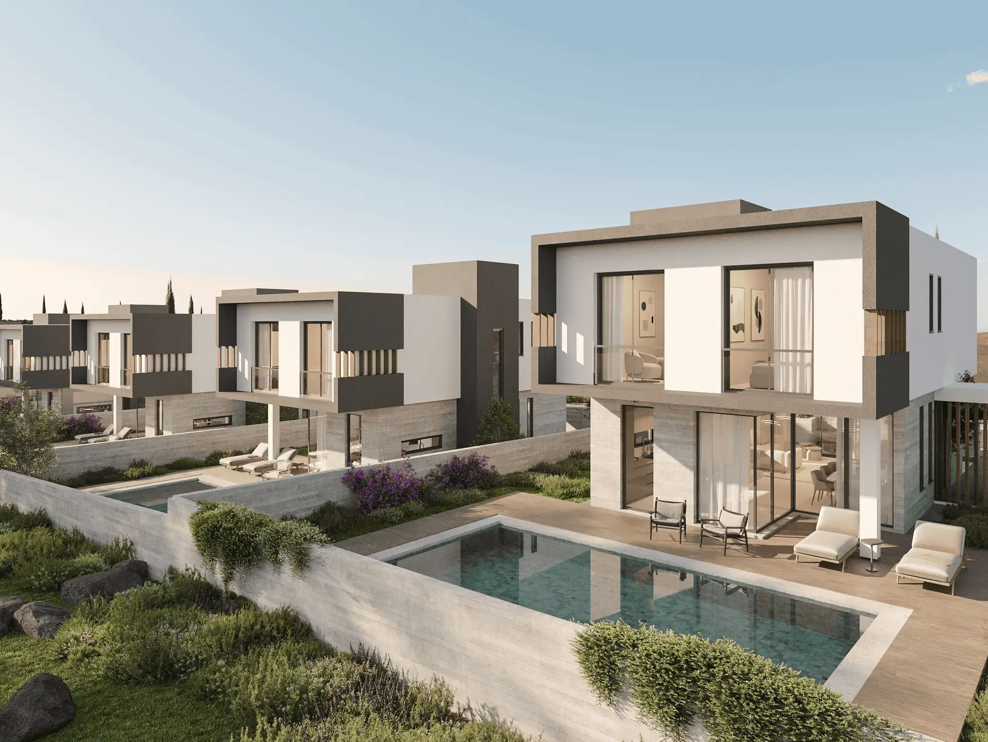 Explore premium villas and apartments across Paphos’ top locations, featuring modern design and outstanding views. All properties are conveniently close to beaches, amenities, and lively community areas.